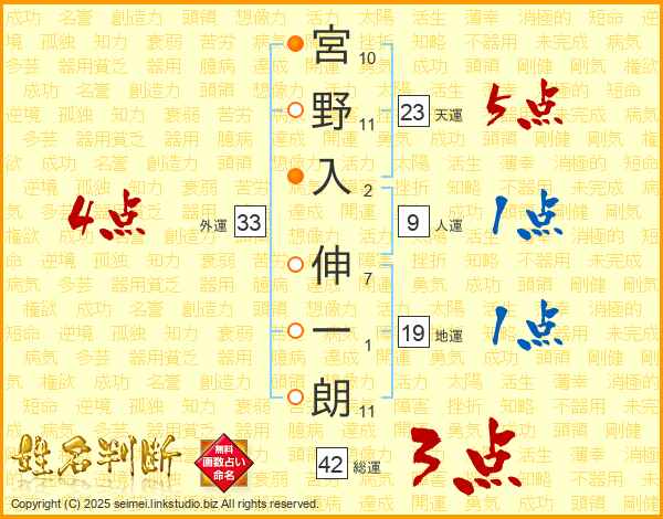 宮(10画)野(11画)入(2画) 伸(7画)一(1画)朗(11画)