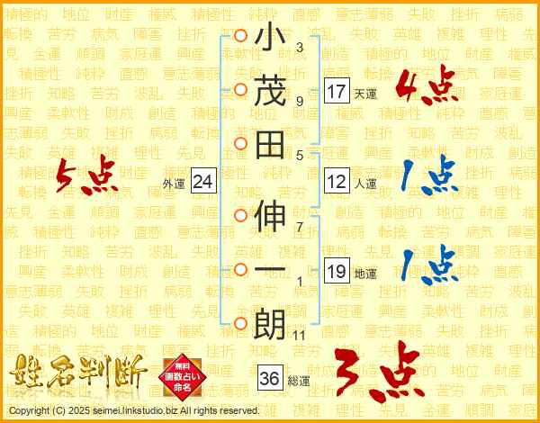 小(3画)茂(9画)田(5画) 伸(7画)一(1画)朗(11画)