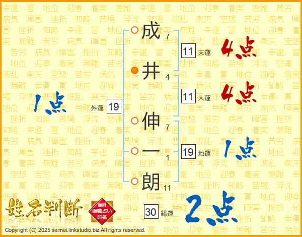 成(7画)井(4画) 伸(7画)一(1画)朗(11画)