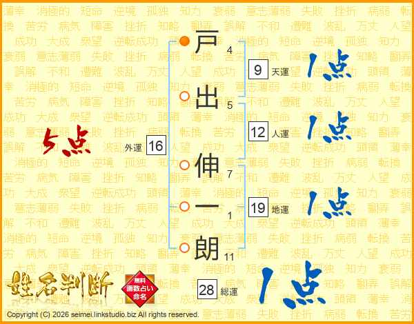 戸(4画)出(5画) 伸(7画)一(1画)朗(11画)