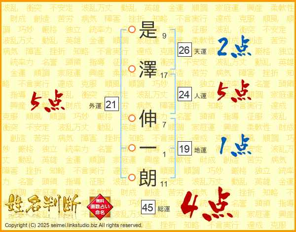 是(9画)澤(17画) 伸(7画)一(1画)朗(11画)