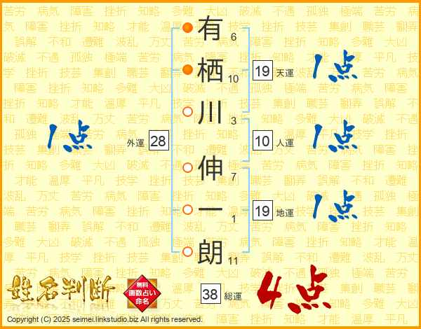 有(6画)栖(10画)川(3画) 伸(7画)一(1画)朗(11画)
