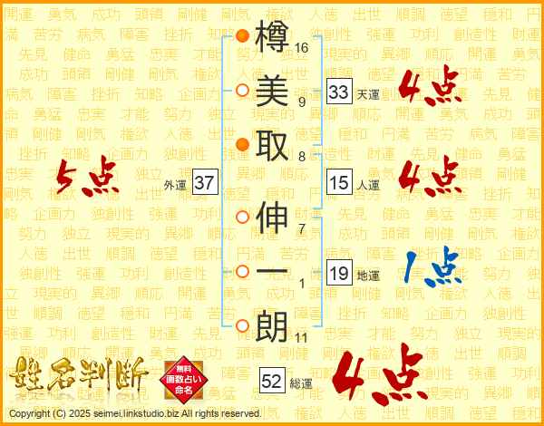 樽(16画)美(9画)取(8画) 伸(7画)一(1画)朗(11画)