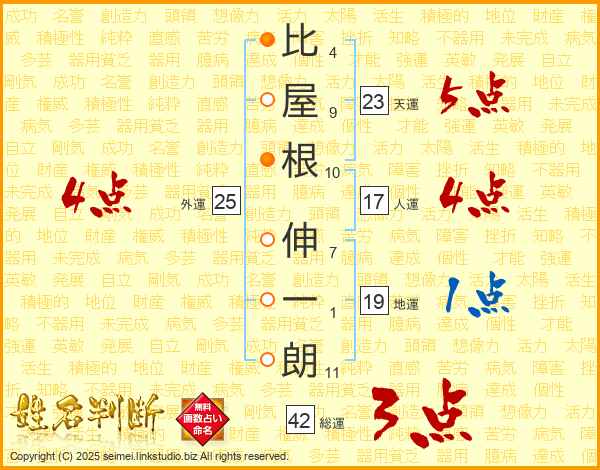 比屋根伸一朗さんの天運は23画の5点!