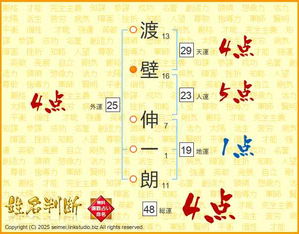 渡(13画)壁(16画) 伸(7画)一(1画)朗(11画)