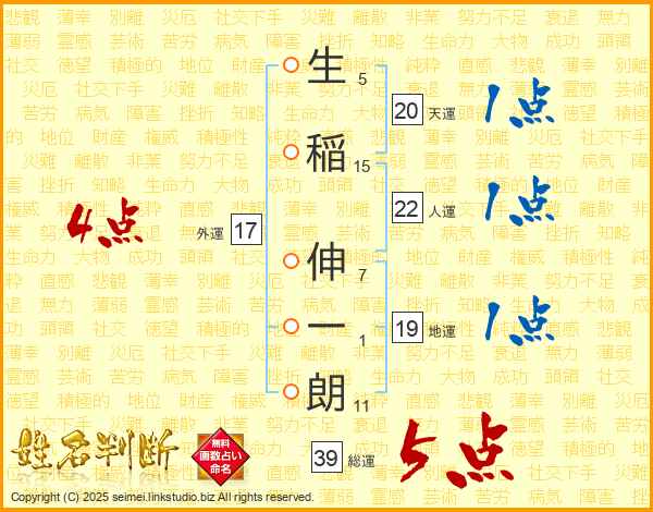 生(5画)稲(15画) 伸(7画)一(1画)朗(11画)