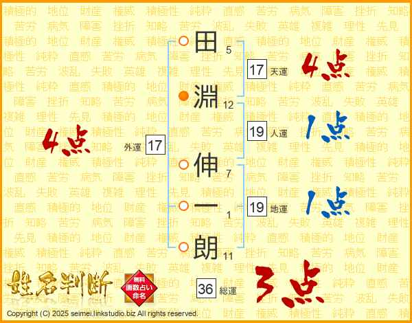 田(5画)淵(12画) 伸(7画)一(1画)朗(11画)