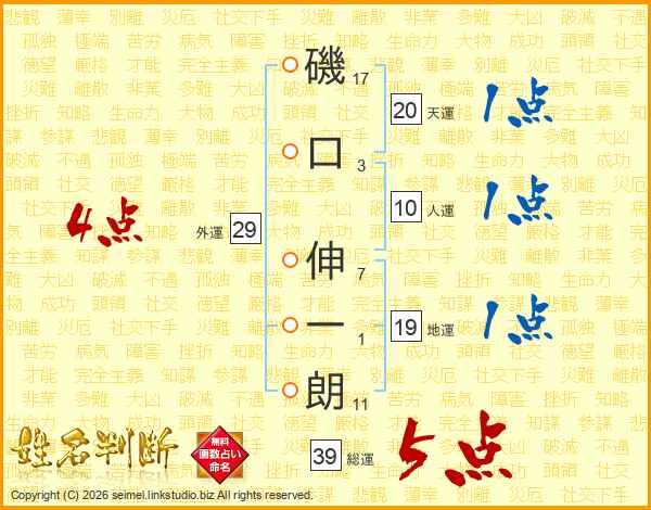磯(17画)口(3画) 伸(7画)一(1画)朗(11画)