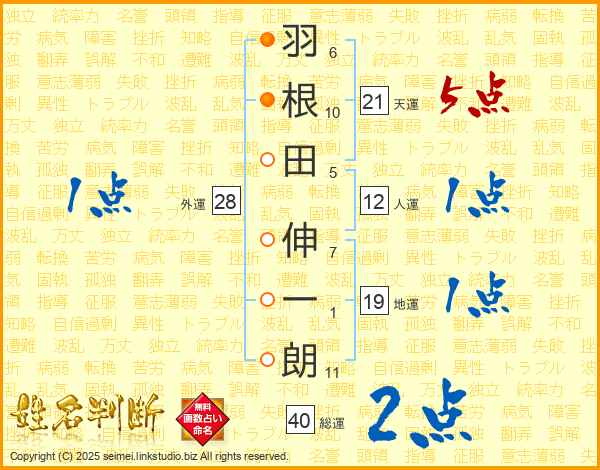 羽(6画)根(10画)田(5画) 伸(7画)一(1画)朗(11画)