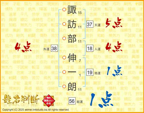 諏(15画)訪(11画)部(11画) 伸(7画)一(1画)朗(11画)