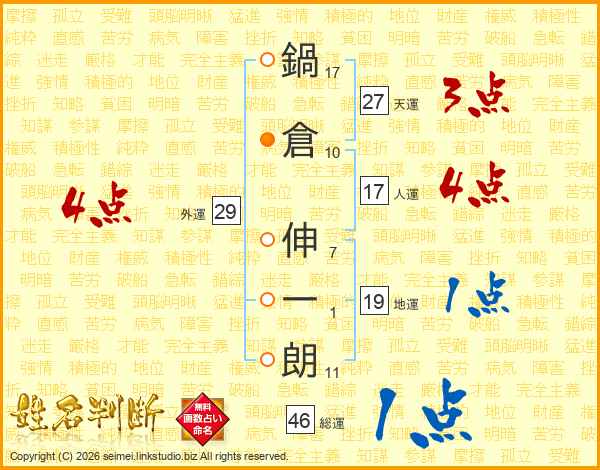 鍋(17画)倉(10画) 伸(7画)一(1画)朗(11画)