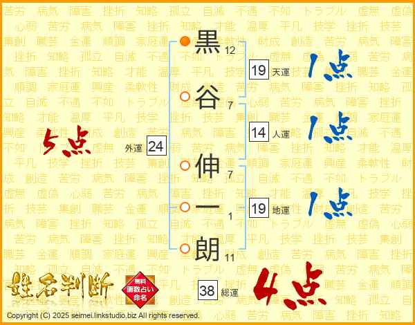 黒(12画)谷(7画) 伸(7画)一(1画)朗(11画)