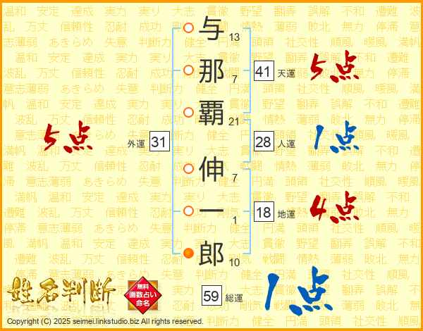 与(13画)那(7画)覇(21画) 伸(7画)一(1画)郎(10画)