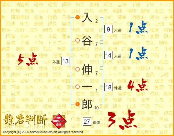 入(2画)谷(7画) 伸(7画)一(1画)郎(10画)