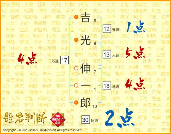 吉(6画)光(6画) 伸(7画)一(1画)郎(10画)
