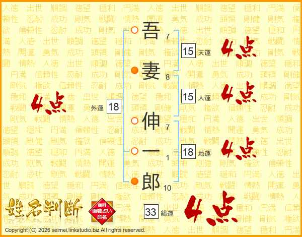 吾(7画)妻(8画) 伸(7画)一(1画)郎(10画)