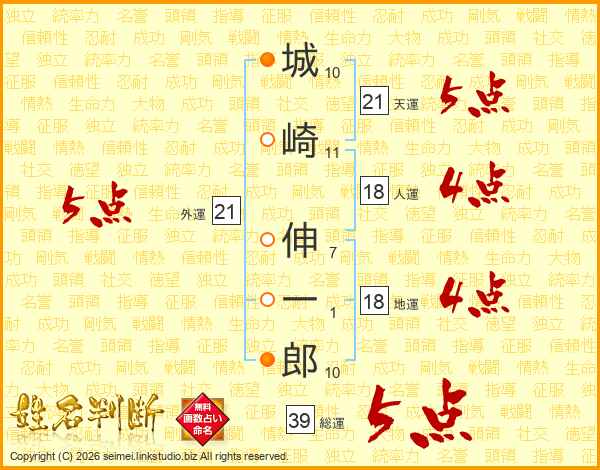 城(10画)崎(11画) 伸(7画)一(1画)郎(10画)