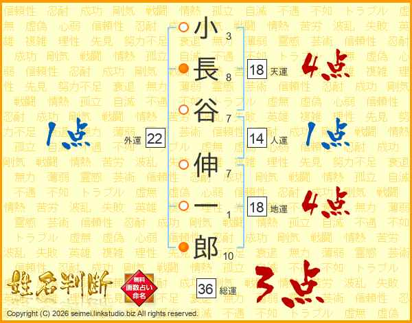小(3画)長(8画)谷(7画) 伸(7画)一(1画)郎(10画)