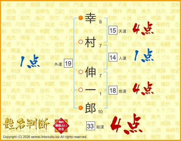 幸(8画)村(7画) 伸(7画)一(1画)郎(10画)