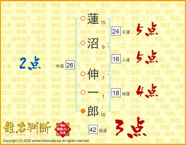 蓮(15画)沼(9画) 伸(7画)一(1画)郎(10画)
