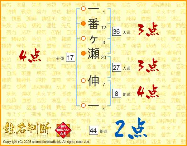 一番ヶ瀬伸一さんの総運は44画の2点!