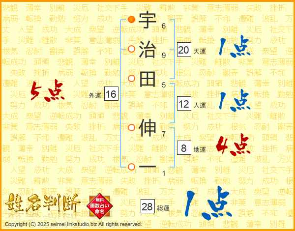 宇(6画)治(9画)田(5画) 伸(7画)一(1画)