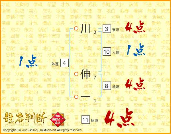 生活面を象徴する運勢です。外部から受ける影響力を表し、結婚運、家庭運や職場、環境への順応性を表します。総運から人運を引いた画数。姓や名が1文字の場合を除く。