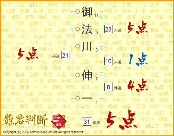御法川伸一さんの総運は31画の5点!