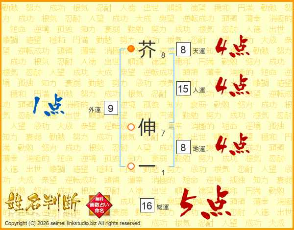 生活面を象徴する運勢です。外部から受ける影響力を表し、結婚運、家庭運や職場、環境への順応性を表します。総運から人運を引いた画数。姓や名が1文字の場合を除く。