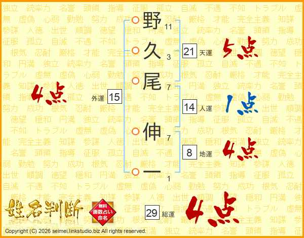野(11画)久(3画)尾(7画) 伸(7画)一(1画)