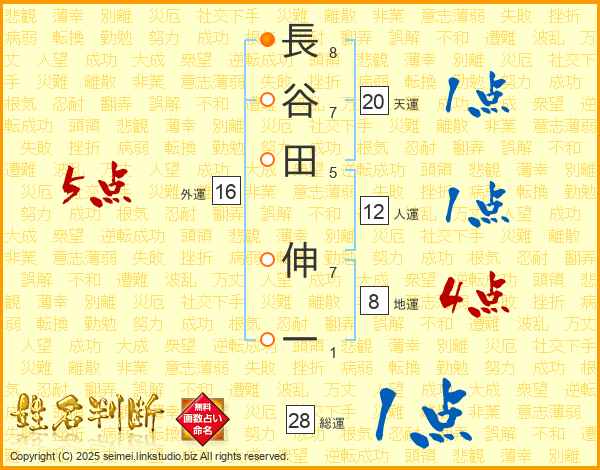 長(8画)谷(7画)田(5画) 伸(7画)一(1画)