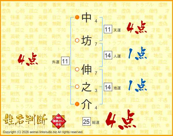 中(4画)坊(7画) 伸(7画)之(3画)介(4画)