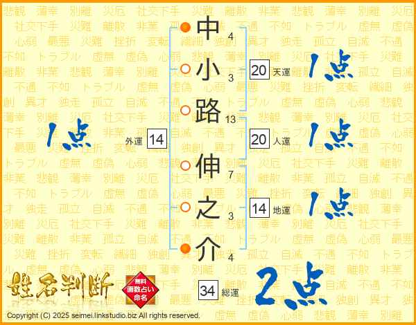生活面を象徴する運勢です。外部から受ける影響力を表し、結婚運、家庭運や職場、環境への順応性を表します。総運から人運を引いた画数。姓や名が1文字の場合を除く。