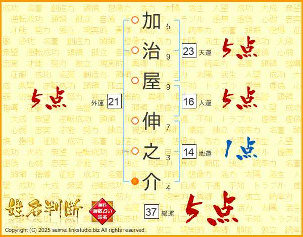 加(5画)治(9画)屋(9画) 伸(7画)之(3画)介(4画)