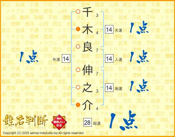 千(3画)木(4画)良(7画) 伸(7画)之(3画)介(4画)