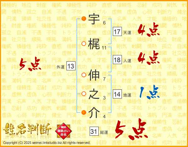 宇(6画)梶(11画) 伸(7画)之(3画)介(4画)