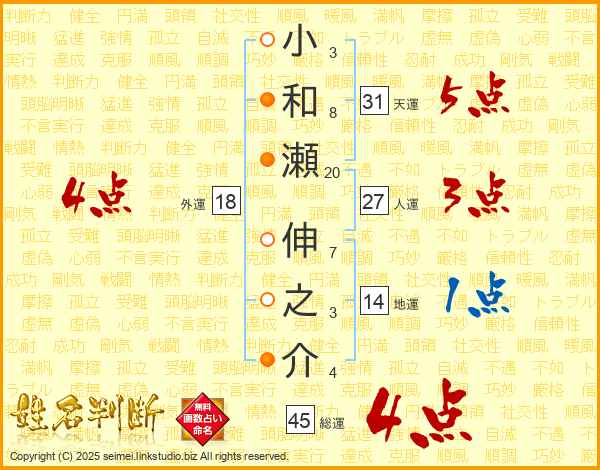 小(3画)和(8画)瀬(20画) 伸(7画)之(3画)介(4画)