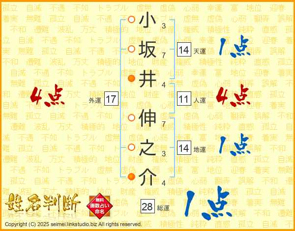 小(3画)坂(7画)井(4画) 伸(7画)之(3画)介(4画)