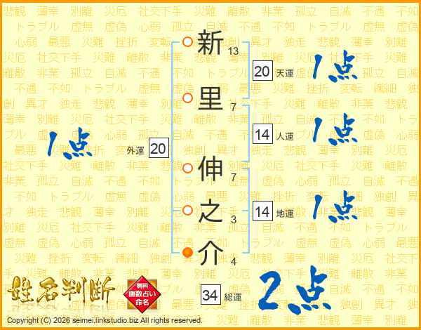 生活面を象徴する運勢です。外部から受ける影響力を表し、結婚運、家庭運や職場、環境への順応性を表します。総運から人運を引いた画数。姓や名が1文字の場合を除く。