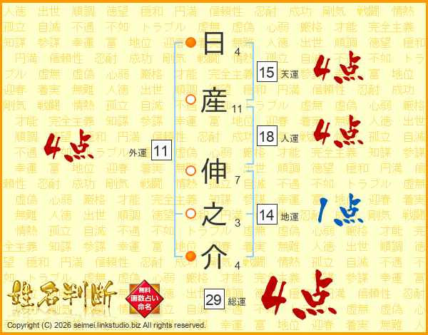 日(4画)産(11画) 伸(7画)之(3画)介(4画)