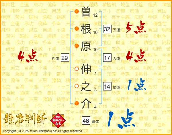 曽(12画)根(10画)原(10画) 伸(7画)之(3画)介(4画)