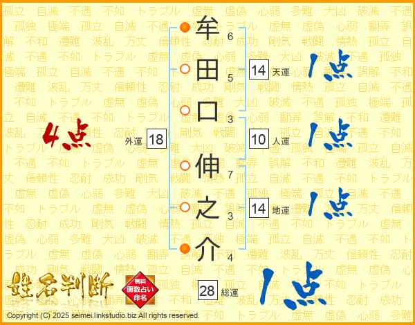 牟(6画)田(5画)口(3画) 伸(7画)之(3画)介(4画)