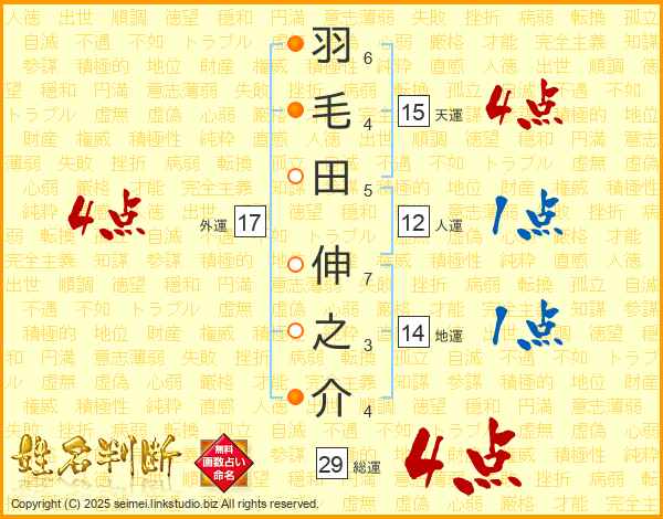 羽毛田伸之介さんの総運は29画の4点!