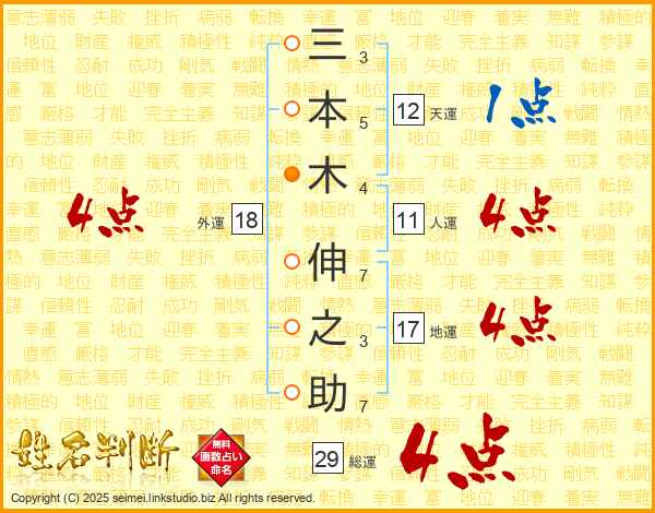 三(3画)本(5画)木(4画) 伸(7画)之(3画)助(7画)