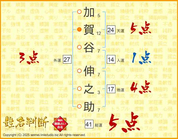 加(5画)賀(12画)谷(7画) 伸(7画)之(3画)助(7画)