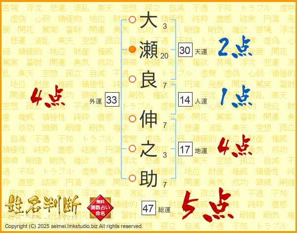 大(3画)瀬(20画)良(7画) 伸(7画)之(3画)助(7画)