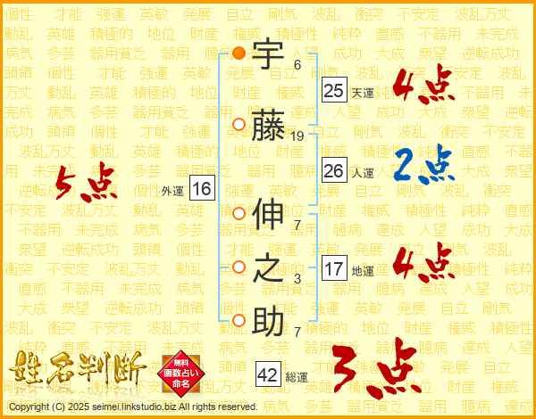 宇(6画)藤(19画) 伸(7画)之(3画)助(7画)