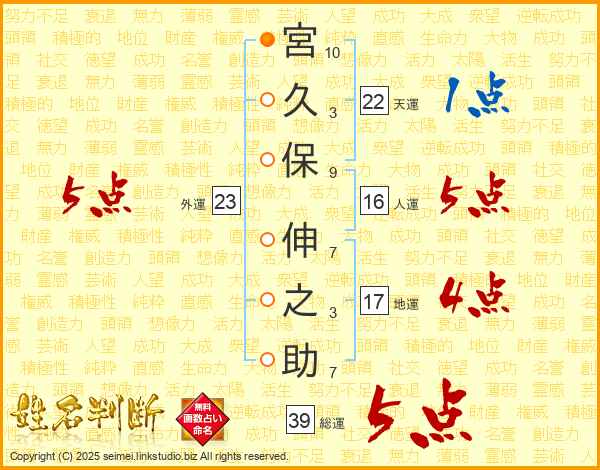 宮(10画)久(3画)保(9画) 伸(7画)之(3画)助(7画)