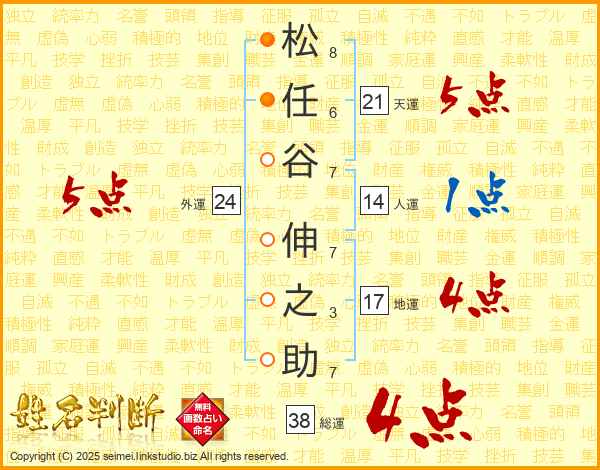 松(8画)任(6画)谷(7画) 伸(7画)之(3画)助(7画)