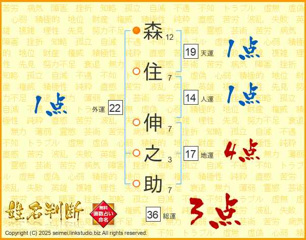 森(12画)住(7画) 伸(7画)之(3画)助(7画)